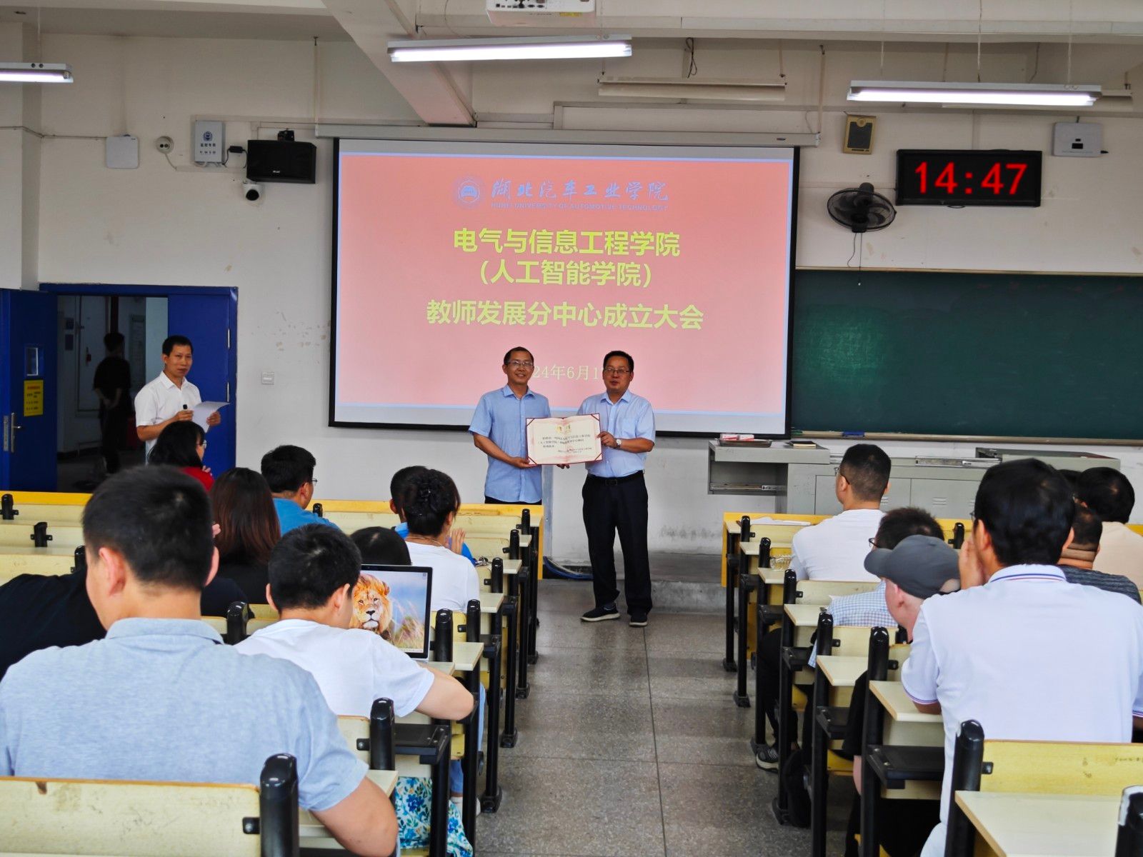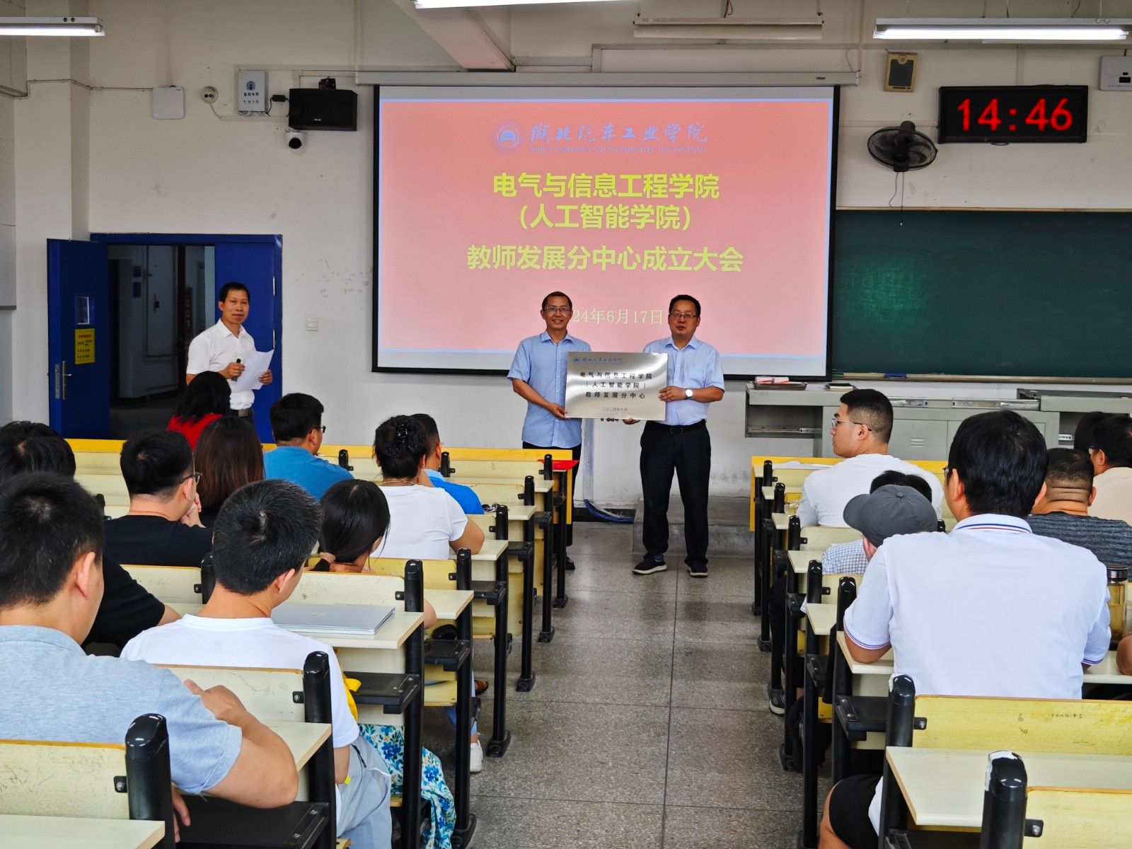 会上,周学良副院长宣读了《关于成立电气与信息工程学院教师发展分中心的通知》。郭一鸣教授代表学校教师发展中心为分中心授牌,周鹏书记向分中心特聘顾问郭一鸣教授颁发聘书。