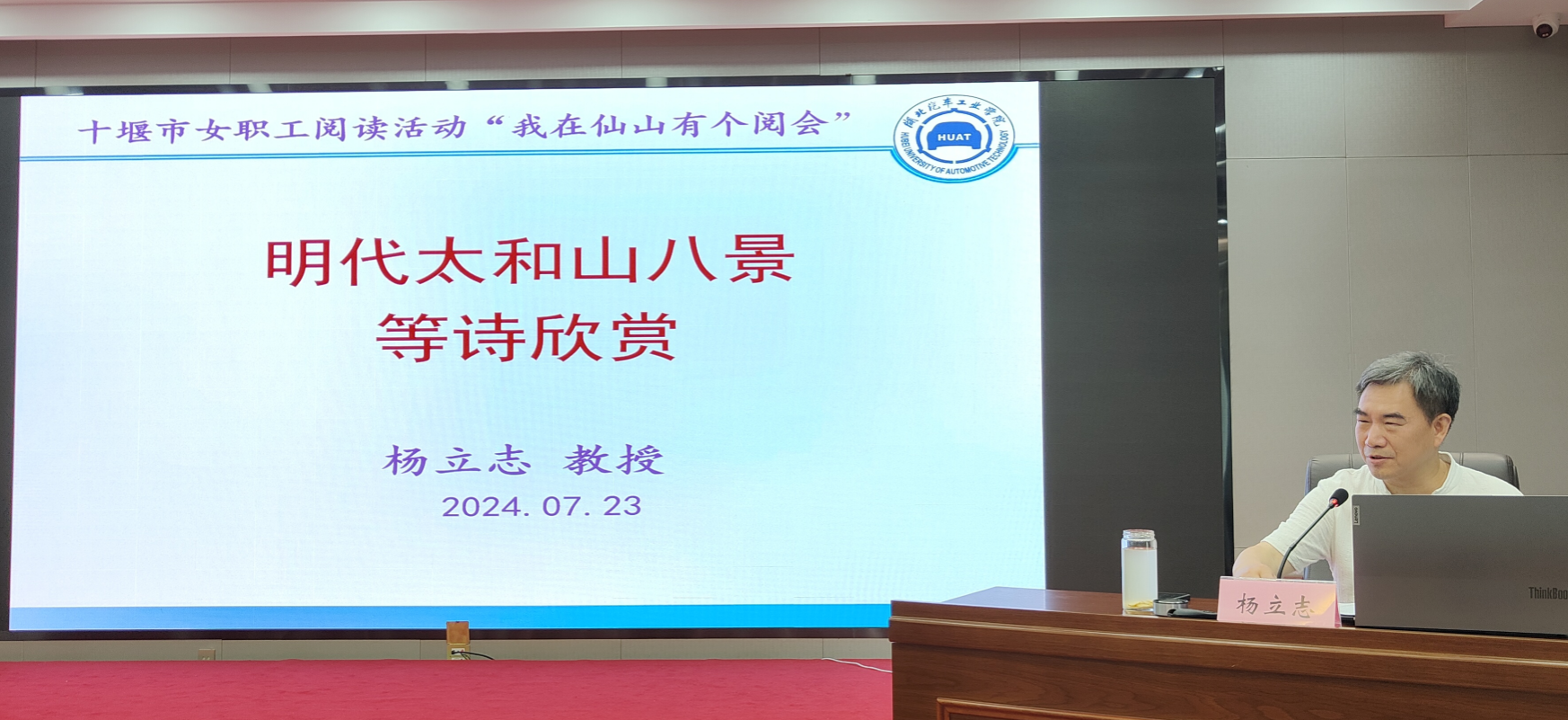 本网讯(文 张慧仙/图 王莽莽)7月23日,由十堰市总工会女职工委员会主办的“玫瑰书香 阅美十堰”女职工主题阅读示范活动在十堰市工人文化宫举行,我校人文学院教授、湖北省人文社科重点研究基地武当文化研究与传播中心主任杨立志应邀做《明代太和山八景等诗欣赏》专题讲座。十堰市总工会党组书记、常务副主席凌燕,市总工会党组成员、副主席吴海燕,市总工会党组成员、副主席杨东芳等出席活动。