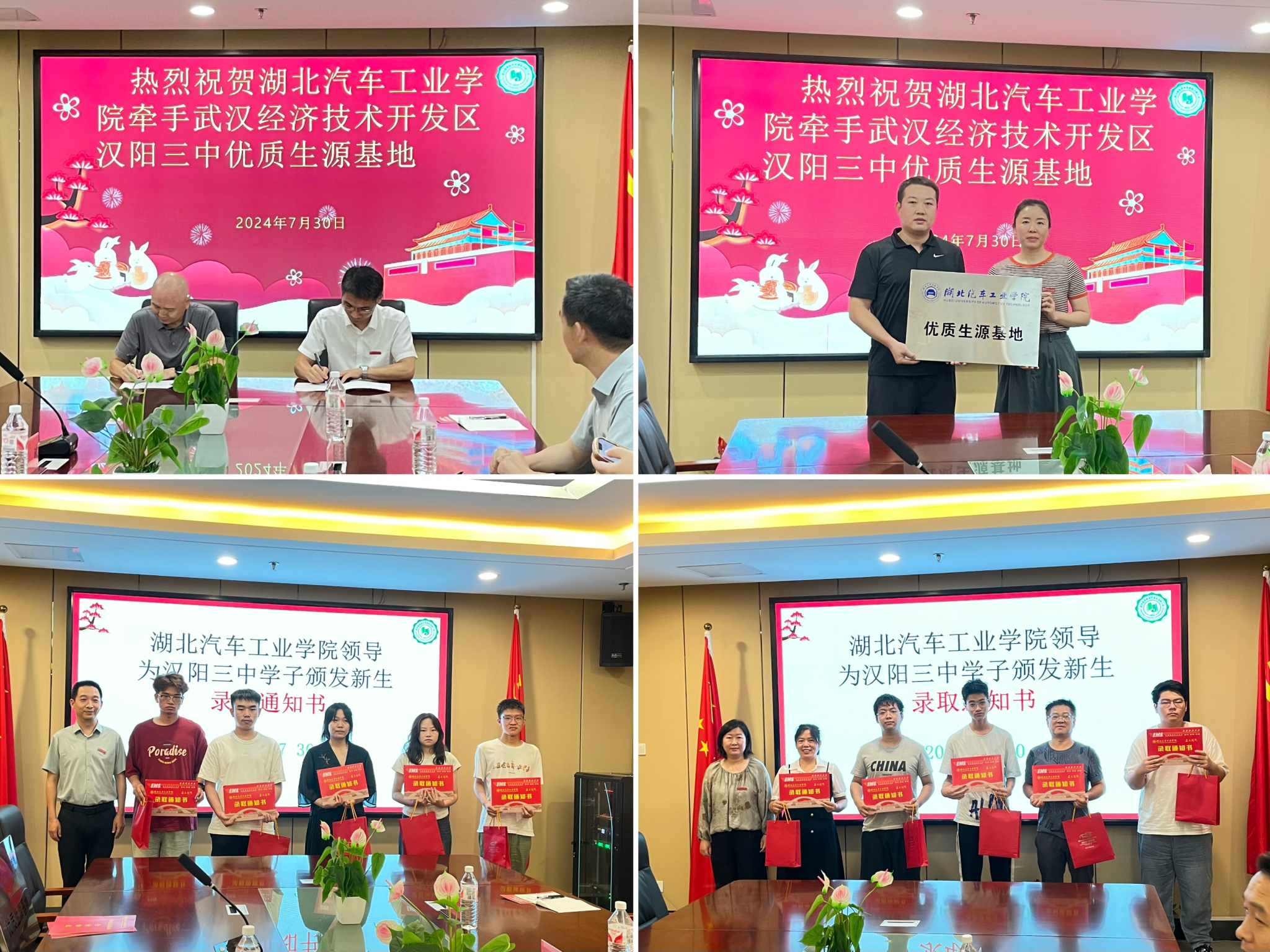 活动期间,黄进涛代表学校与汉阳三中签署共建优质生源地协议;向平代表学校为汉阳三中授牌;刘荣、王新为学生颁发2024年录取通知书及纪念品。(审稿 王新)