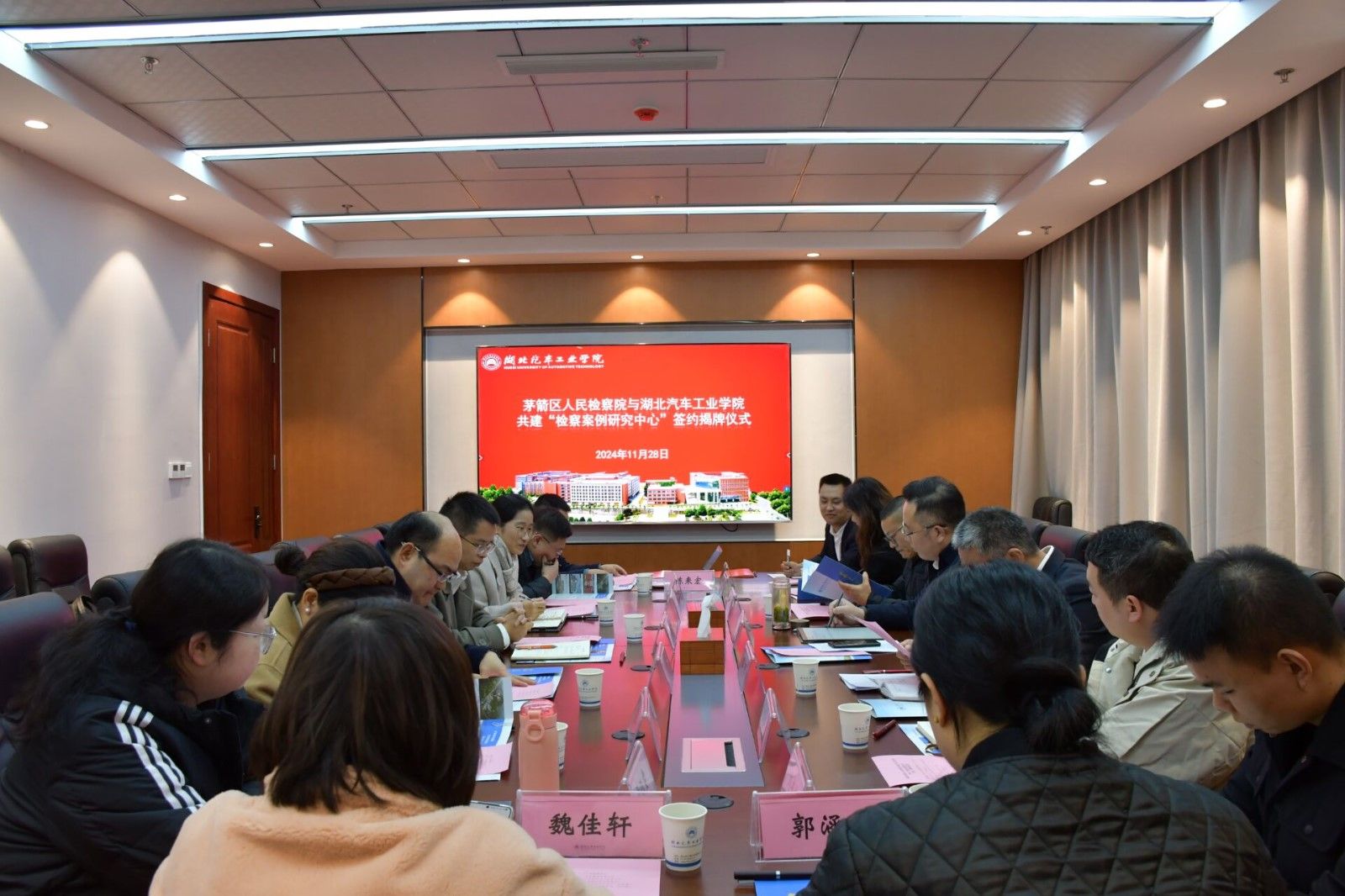 本网讯(文 郑实/图 张俊威)11月28日下午,我校与茅箭区人民检察院检校共建“检察案例研究中心”签约暨揭牌仪式在产教大楼三楼多功能会议室举行。茅箭区检察院党组书记、检察长查孟达,党组副书记、副检察长吕丹等领导及部门负责人,我校人文学院院长黄永昌、副院长成继平、副院长安军、法学系主任陈来宏、法学系专业负责人景勤及部分法学专业教师参加了仪式。签约暨揭牌仪式由安军主持。