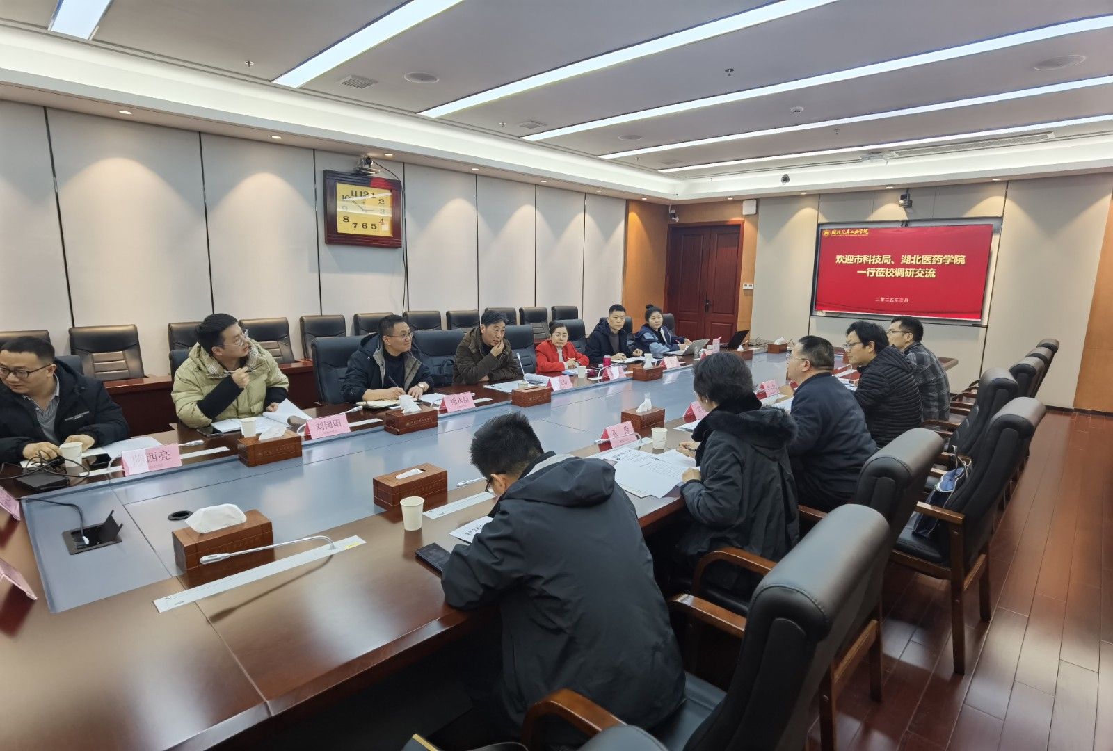 本网讯(文/图 董超)3月7日下午,十堰市科技局党组成员、副局长刘其乐,成果转化科科长张玲、副科长朱俊,湖北医药学院科学技术发展研究院副院长李健,成果科科长宋园亮一行5人莅临我校交流省级科研平台筹建工作。交流会由我校科发院院长张元好主持。