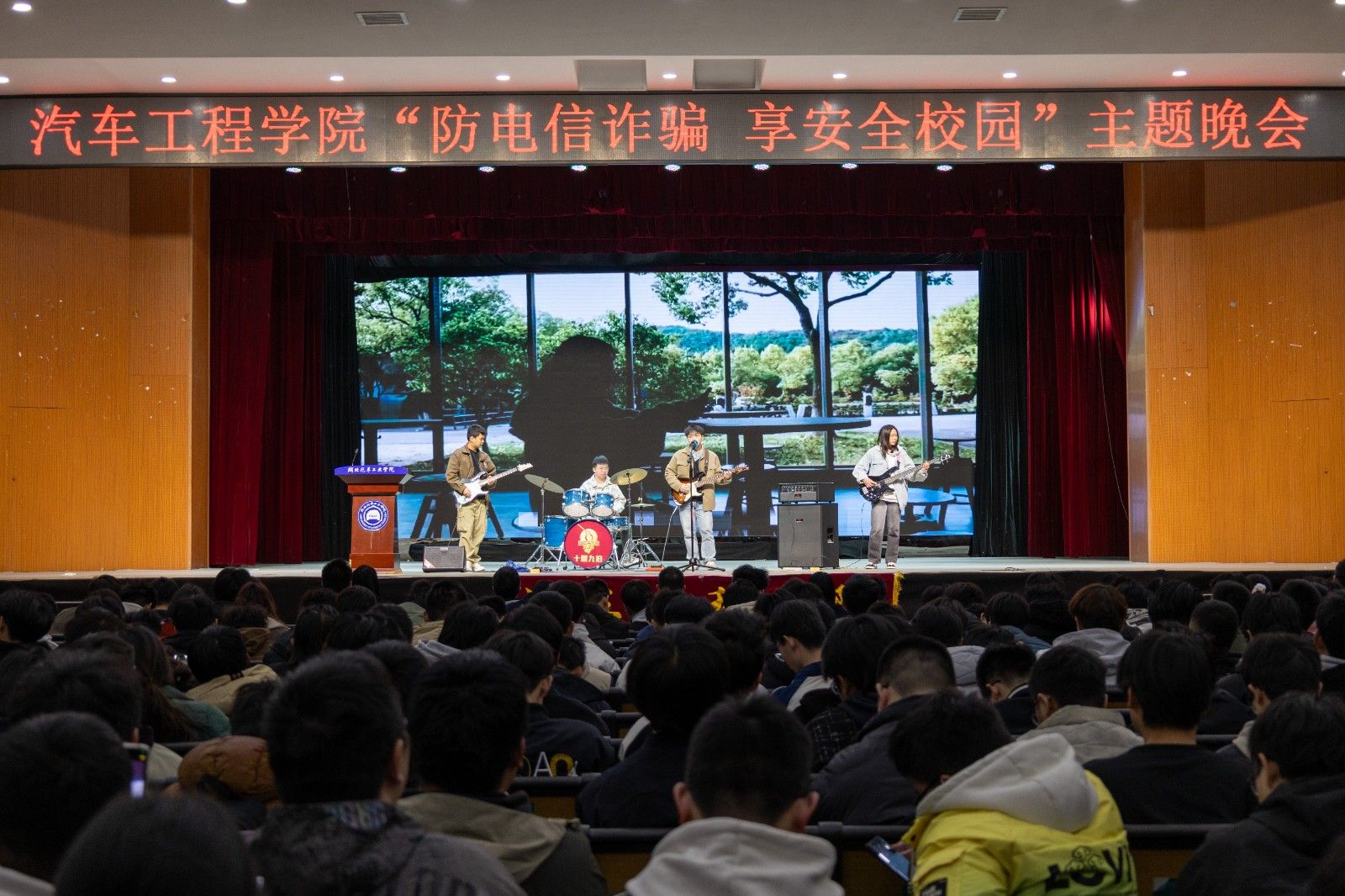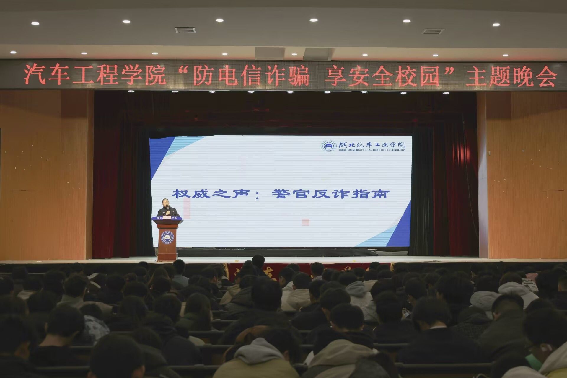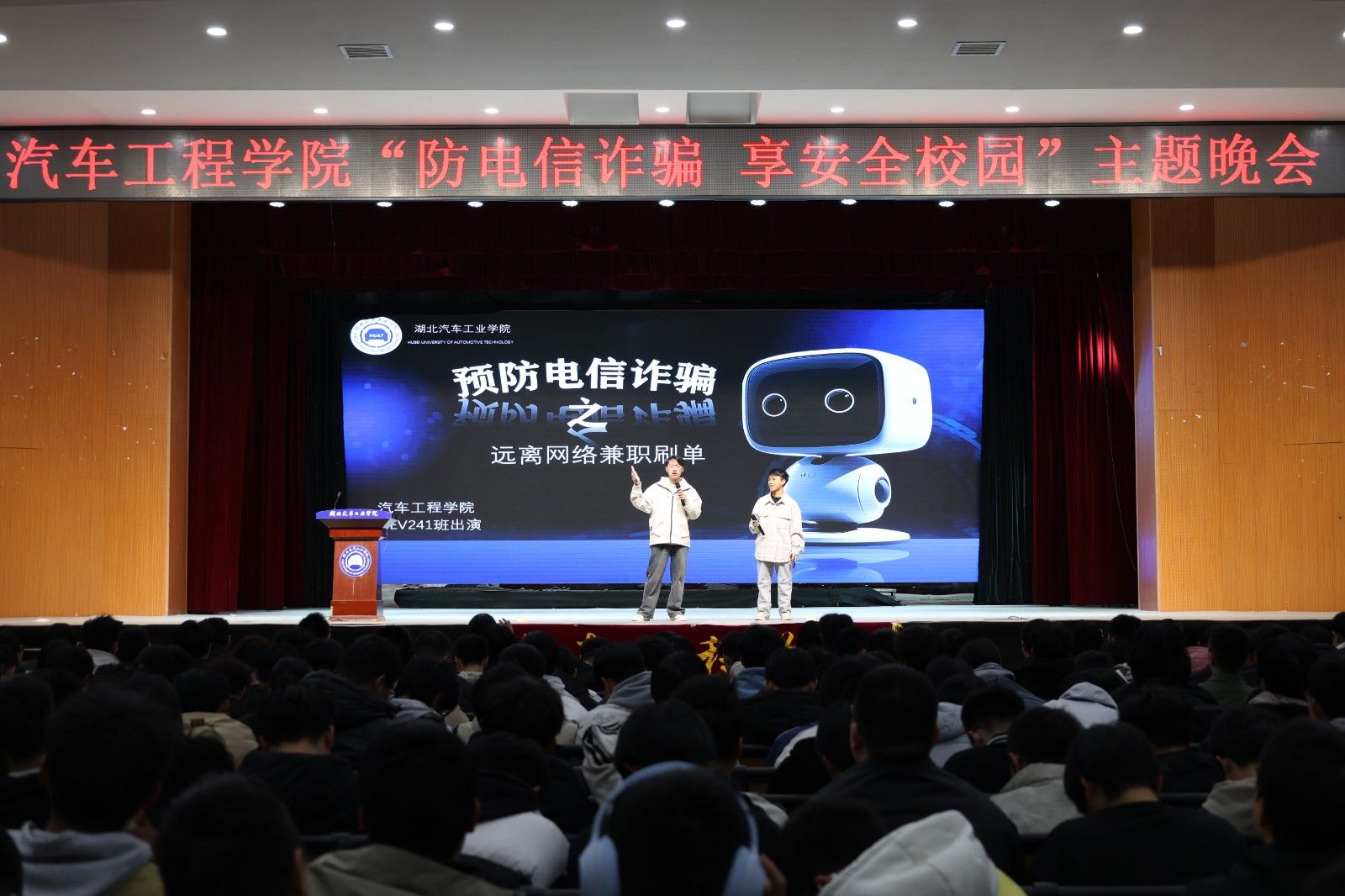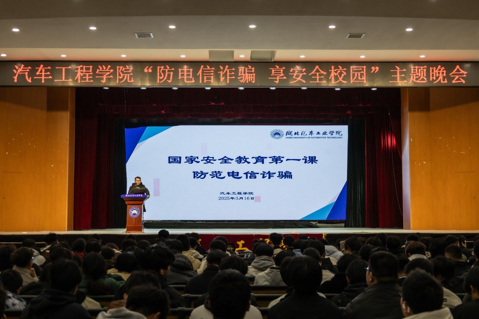 本网讯(文/王裕)3月16日晚,学校大礼堂内掌声与惊呼声交织,一场融合刑侦实战与青春创意的“反电信诈骗 享安全校园”主题晚会在此上演。辖区派出所、学工部、保卫处、与汽车工程学院师生联动,通过情景还原、数据解剖、AI技术演示等创新形式,为2024级新生打造了一堂“听得进、记得住、传得开”的反诈必修课。中区派出所警官韦子永,学校保卫处处长杨长春,学工部部长王关锋、副部长杜昕俊,汽车工程学院党委副书记周彬以及学院辅导员和2024级全体学生共同参与。
