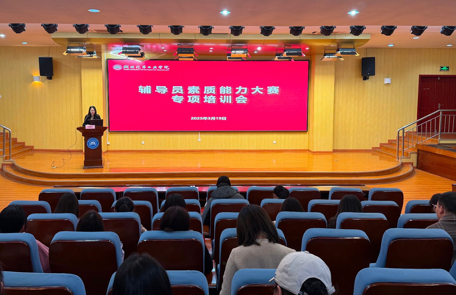 本网讯(文 晏冉/图 刘婷)3月19日下午,学校在图书馆报告厅成功举办辅导员素质能力专项培训会。会议邀请到全国高校辅导员素质能力提升骨干训练营“十佳标兵”、第十一届湖北省高校辅导员素质能力大赛一等奖获得者,来自华中科技大学土木与水利工程学院的张誉千老师为全体辅导员作素质能力大赛经验分享。学工部副部长杜昕俊、各二级学院副书记及全体辅导员参加会议。