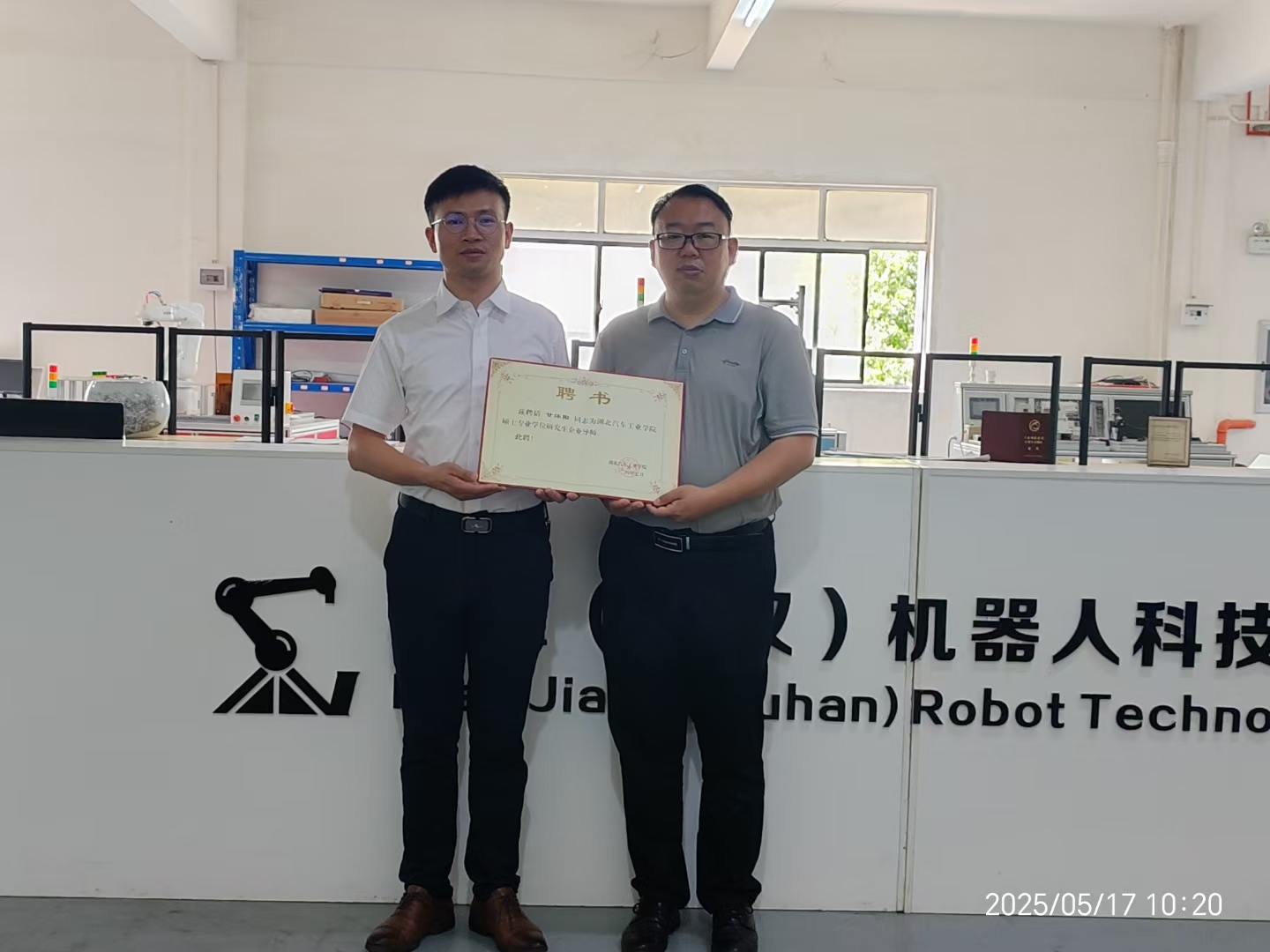 17日上午,在优秀校友甘沐阳的陪同下,学院一行走访了苗疆(武汉)机器人科技有限公司。总经理韩宏伟详细介绍了公司的发展历程、核心产品和战略规划。在参观研发中心和生产车间过程中,双方就技术成果与优势展开交流,在人才培养、实习实训、就业创业及技术攻关等方面达成合作意向。基于前期良好合作基础,周原现场为甘沐阳等企业专家颁发了学院硕士专业学位研究生企业导师聘书,为后续研究生联合培养与技术研发合作奠定基础。